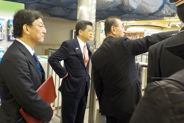 JR松戸駅バリアフリー化事業の状況について説明を受ける石井大臣