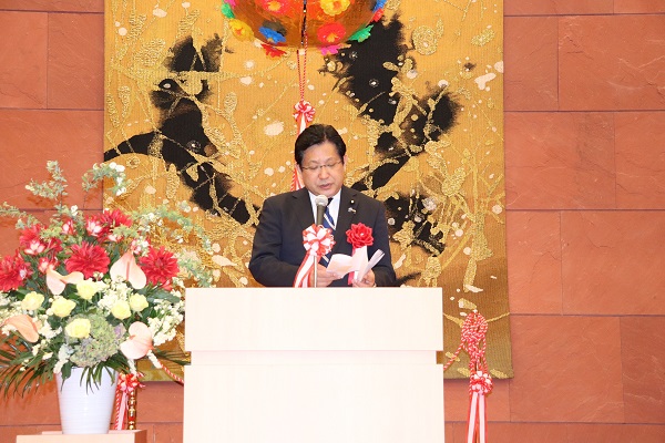 竣工式で挨拶する塚田副大臣
