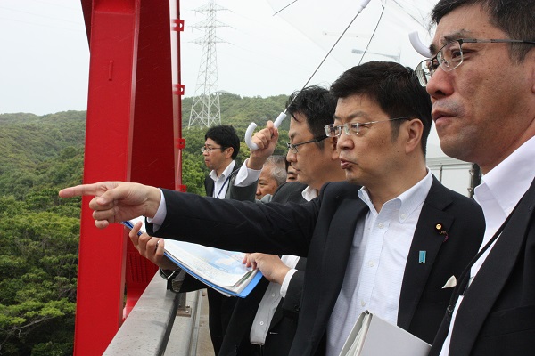 万関橋上で万関瀬戸航路の現況について説明を受ける阿達政務官