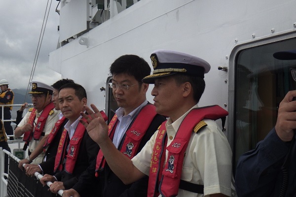 対馬海上保安部所属「巡視船あさじ」で洋上訓練等を視察する阿達政務官