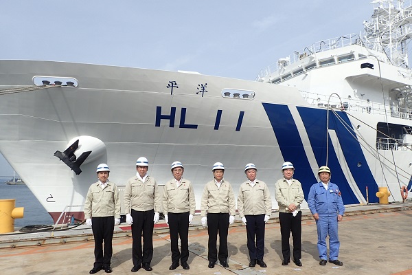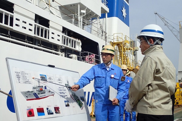 また、山口県下関市の造船所において、石井大臣の揮毫による船名が表示された海上保安庁の大型測量船「平洋」(船名は公募により決定)ほか2隻の大型巡視船の建造状況を視察しました。
