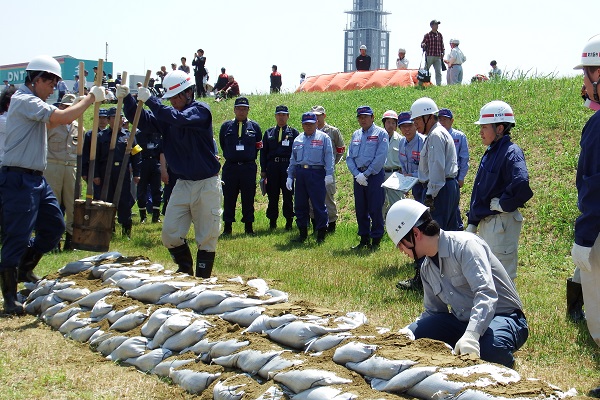 演習には国土交通省ほか、大阪府、大阪市、水防団、自衛隊などに加え、地元企業、学校などの多様な機関が参加し、水害時に堤防を守るための水防工法訓練、地域住民避難のための情報伝達訓練、都市型水害を想定した避難訓練、人命救助訓練などを中心に、タイムラインに沿った、より実践的な訓練を実施しました。