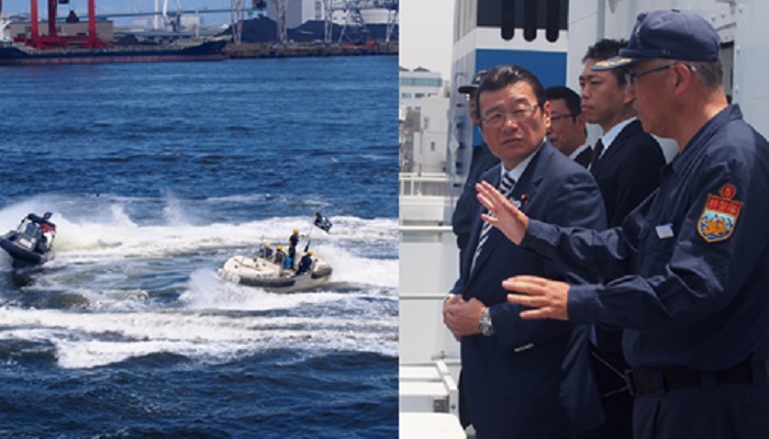 ゴムボートによるテロリスト等追跡・捕捉訓練を視察する大塚副大臣