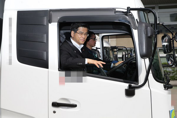 石井大臣は、コンテスト優勝者と意見交換をするとともに、3号館正面駐車場にて大型トラック(11トントラック)に乗車しました。
