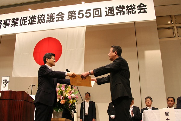 続く第31回全国街路事業コンクール表彰式では、国土交通大臣賞を受賞した松山市(松山広域都市計画道路花園町線整備事業)に、賞状と記念品が石井大臣より手渡されました。