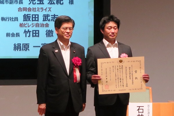 同大会では、「まちづくり月間まちづくり功労者国土交通大臣表彰」、「まちづくり月間関連国土交通大臣表彰」、「都市景観大賞」の表彰が行われ、国土交通大臣表彰を受賞された団体に対し、石井大臣が表彰状を授与しました。