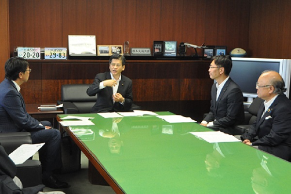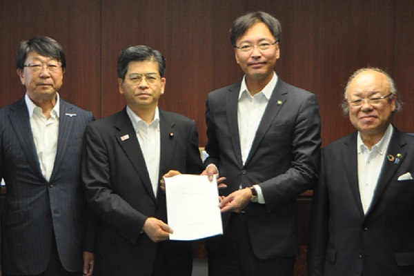 6月28日、「第15回水害サミット」(6月11日開催、大臣出席)において採択された『水害から命を守る緊急提言』が、水害サミット発起人の國定三条市長、久住見附市長、中貝豊岡市長から、石井大臣に対して手交されました。