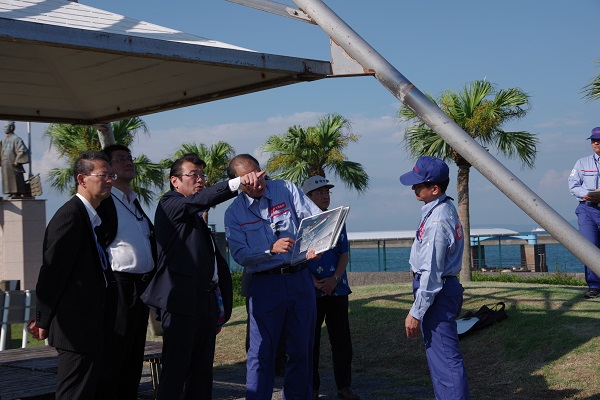 指宿港海岸の直轄海岸保全施設整備事業の進捗状況を視察する大塚副大臣