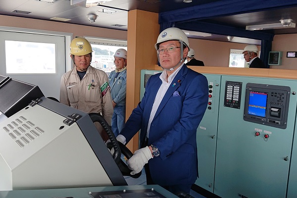 (株)大島造船所で建造中の船舶を視察する大塚副大臣