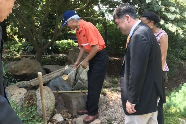 オクラホマ州スティルウォーター市の日本庭園を視察する田中政務官