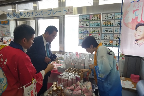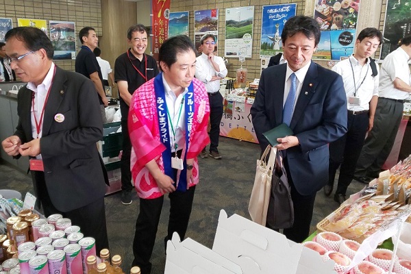 石井大臣、牧野副大臣、大塚副大臣、工藤政務官がフェア会場を視察し、福島県産品などの説明を聞き、福島県の方々を激励しました。