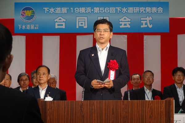開会式では、「下水道は、都市水害から命を守る重要なインフラとして我が国の発展の歴史を支えてきた。この機会に多くの皆様が下水道に関心を持っていただくとともに、我が国の下水道技術について、理解をさらに深めていただくことを祈念する。」と挨拶をしました。