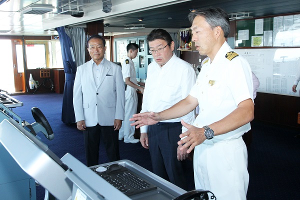 海事観光の戦略的推進に取り組んでいるところであり、外航・内航クルーズで活躍する日本籍クルーズ船の運航状況等について説明を受けるとともに、ブリッジ、客室、各デッキの施設等を視察しました。