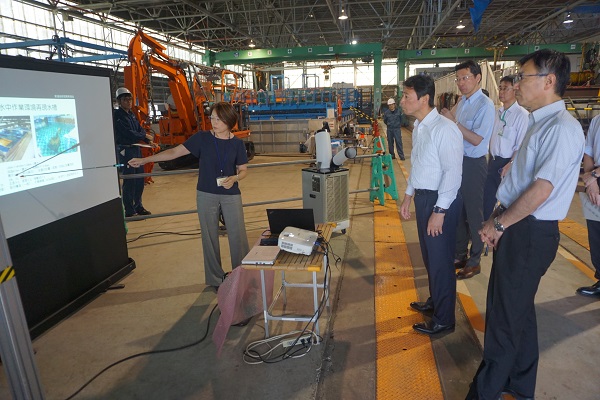 水中作業環境再現水槽の説明を受ける工藤政務官