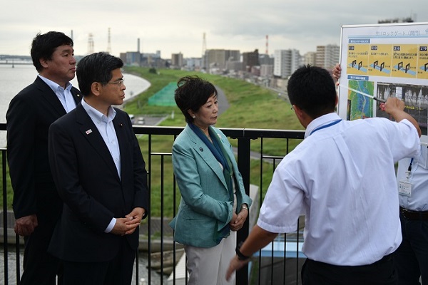 荒川ロックゲートで東京ゼロメートル地帯の状況について説明を受ける石井大臣と小池都知事