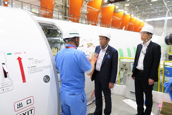 8月23日、大塚副大臣は、県営名古屋空港を訪れ、2020年半ばの初号機納入に向けて三菱航空機により開発が進められている、スペースジェット(旧MRJ)の開発現場を視察しました。
