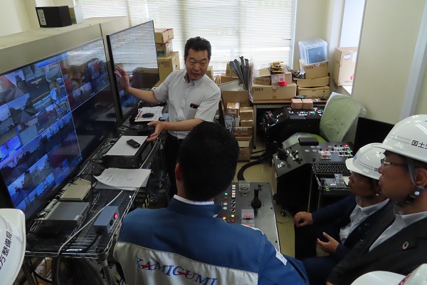 PC-18コンテナターミナルで遠隔操作について説明を受ける阿達政務官