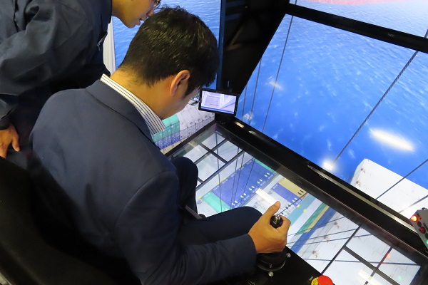 港湾技能研修センターでガントリークレーンシミュレータを体験する阿達政務官