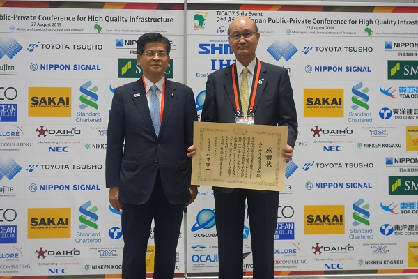また、その際、石井大臣より、アフリカ・インフラ協議会(JAIDA)に対して、発足以来のアフリカ各国における日本の質の高いインフラの推進への貢献に対して感謝状が贈呈されました。