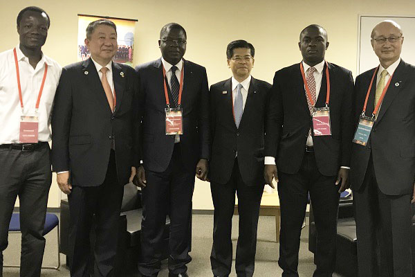 コートジボワール共和国クアク大臣、JAIDA宮本会長、奥村代表と記念撮影する石井大臣