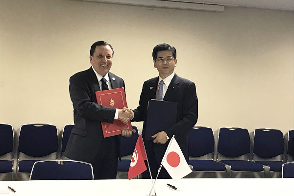 チュニジア共和国ジヒナウイ大臣とMOC署名の記念撮影をする石井大臣