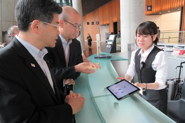 国立新美術館で通訳サービスアプリ「SMILE CALL」について説明を受ける石井大臣