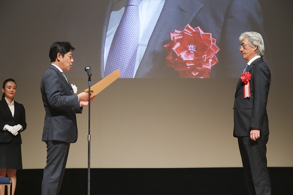 あわせて、運輸安全マネジメント優良事業者等に対する国土交通大臣表彰式が行われ、「上野トランステック株式会社」に対して青木副大臣が表彰状を授与しました。