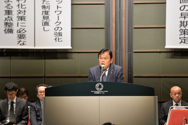 赤羽大臣は挨拶の中で、本年発生した台風災害や近年発生した激甚災害の被災地の首長の皆様からの声に応えられるよう、現場力を最大限に発揮し、災害対応に全力を尽くしており、また抜本的な防災・減災、国土強靱化が必要であるほか、「地元の意見を踏まえつつ、必要な道路整備を着実に推進し、安全・安心な社会づくりに全力を傾けて参ります。」と述べました。