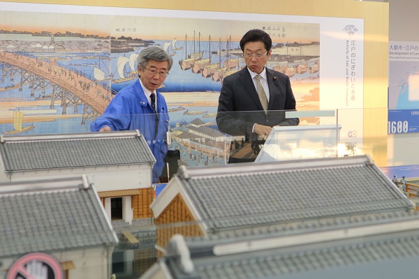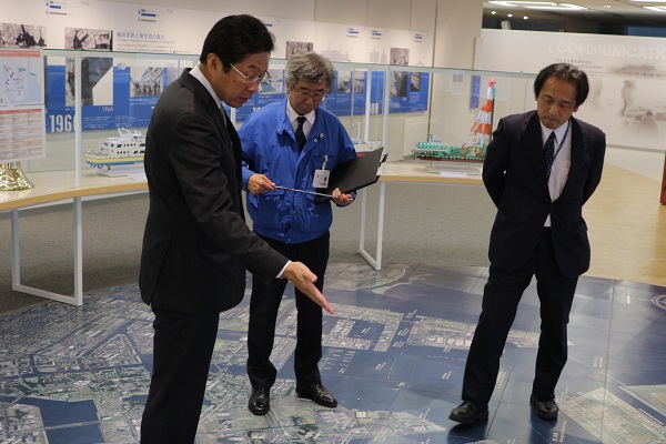 ジオラマにて東京港の歴史の説明を受ける門政務官