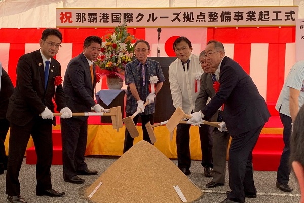 那覇港国際クルーズ拠点整備事業起工式にて鍬入れをする赤羽大臣