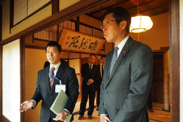 旧滄浪閣(伊藤博文邸跡)で説明を受ける門政務官