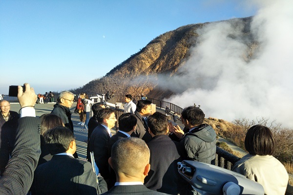 多くの観光客が訪れている大涌谷を視察する赤羽大臣
