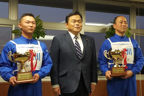 12月16日(月)、赤羽大臣は、第22回全日本自動車整備技能競技大会で、優勝した神奈川県チームの池田誠司さん、渡辺優樹さんに対し、賞状と国土交通大臣杯を授与しました。