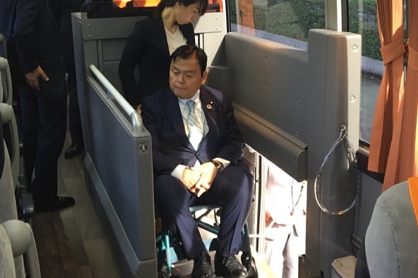 赤羽大臣は試乗後、「これまでも高齢者、障害者の方を含め全ての人が住みよい社会作りを目指し、バリアフリー、ユニバーサルデザインに取り組んできました。来年の2020年には東京オリンピック・パラリンピックがあり、そのレガシーとして、真の共生社会を実現するための大きなステップアップの一年にしたい。このような観点から、リムジンバスのバリアフリー化が進むことは大変意味のあることである。実際に試乗したが、乗り心地は非常に快適で、障害者の方も安心感をもって乗車できると感じた」と発言されました。