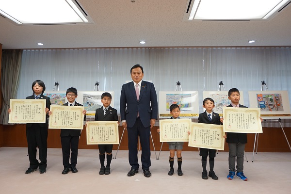 1月14日(火)、令和元年度「国土と交通に関する図画コンクール」国土交通大臣賞の表彰式を執り行い、赤羽大臣が小学生各学年の受賞者6名に賞状を授与しました。