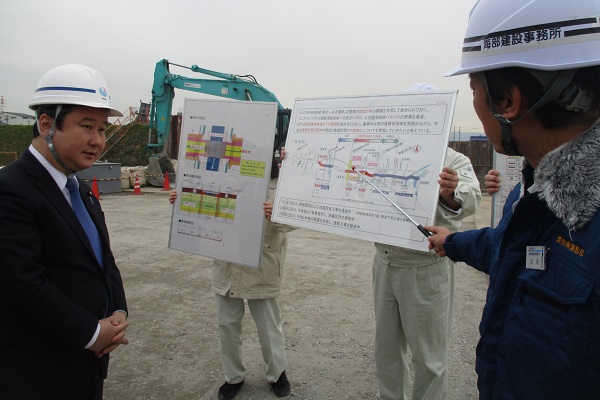 名古屋港海上交通センターでは運用管制室、国道1号尾張大橋では木曽川及び橋梁の現地状況、主要地方道名古屋津島線バイパスでは工事の進捗状況、国道302号では名鉄津島線との交差箇所の現地状況を視察しました。