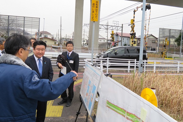 国道302号と名鉄津島線の交差箇所を視察する和田政務官