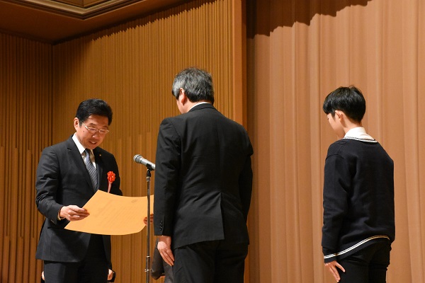 表彰式では、国土交通大臣賞を受賞した豊田市立五ヶ丘東小学校に対し、門政務官より表彰状が授与されました。