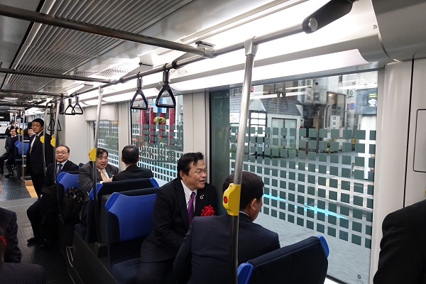 新たに接続した路面電車に記念乗車する赤羽大臣