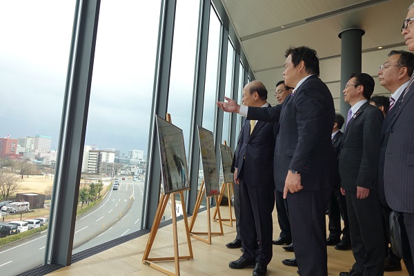 富山県美術館から富岸運河環水公園を視察する赤羽大臣