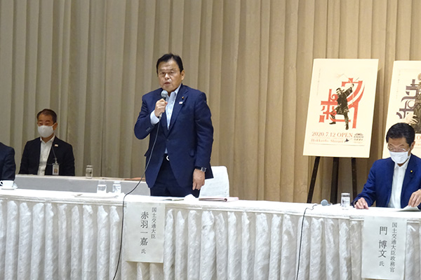 赤羽大臣は7月3日から4日にかけて北海道を訪れ、新千歳空港や北海道新幹線札幌駅、バスタ事業といった所管事業を視察したほか、北海道の観光事業者と、北海道の観光を巡る様々な問題やGoToトラベル事業を含めた今後の取組等について意見交換を行いました。また、今月12日に開業する民族共生象徴空間「ウポポイ」(北海道白老町)で行われた「北海道観光セミナー」に出席し、旅行会社等の参加者に対し、ウポポイの魅力の北海道内外への発信や、教育旅行等におけるウポポイの活用促進などへの協力を呼びかけました。