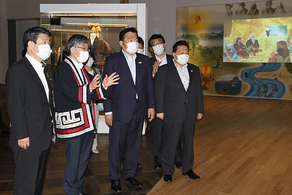 民族共生象徴空間(ウポポイ)の国立アイヌ民族博物館で説明を受ける赤羽大臣
