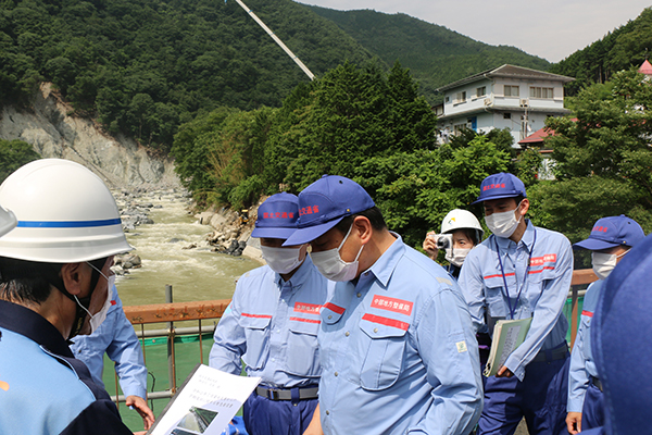 高山市久々野町の飛騨川浸水箇所では、浸水当時の対応状況について説明を受け、今後の復旧方針、対策等について意見を交わしました。