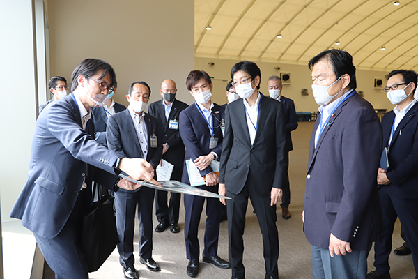 大黒ふ頭客船ターミナルにて発生当時の対応状況について説明を受ける赤羽大臣