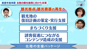 そこで番組では、政府が取りまとめた「被災者の生活と生業支援のためのパッケージ」のうち、観光復興に向けた「北陸応援割」や、北陸が早く元の姿を取り戻すための様々な形の支援を分かりやすくご紹介します。