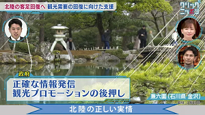 能登半島地震からの復興を目指す北陸の観光産業。地震による各地域の現状が正しく伝わらず、客足の回復に時間がかかっています。そこで番組では、「北陸の正しい実情」について、観光需要の回復に向けて取り組む現場の声を交えて分かりやすく紹介します。また、正確な情報発信や観光プロモーションの後押しなど、政府としての観光需要回復に向けた支援についてご紹介します。