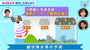 番組では、正確な予測が難しいといわれる線状降水帯に関して、次期静止気象衛星の整備やスーパーコンピュータ「富岳」を活用した予測技術の開発といった取組のご紹介と様々な防災気象情報の活用による早めの避難を呼びかけています。