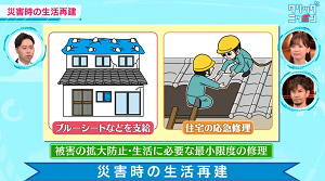 番組では、大規模な災害が起きた時、高齢者や障害者など配慮が必要なかたは、通常の避難所に加えて福祉避難所を利用できること、住まいの被害状況に応じて最大300万円の「被災者生活再建支援金」の支給を受けられること、また、地震、暴風等により屋根に被害を受けた場合には、雨漏りを防ぐためのブルーシートの支給や、一定の被害を受けたかたは住宅の応急修理が受けられること、さらに、住宅の再建に当たって、返済期間が最長35年で融資額は最大5,500万円の「災害復興住宅融資」を利用できることなど、住まいと生活の再建に向けた政府の支援についてご紹介します。