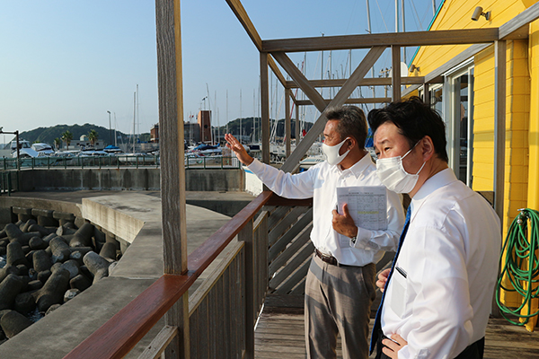 葉山マリーナにて説明を受ける和田政務官