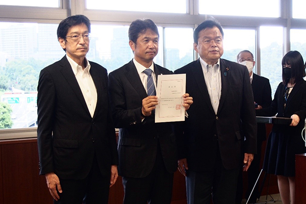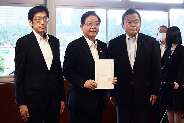 【令和2年9月2日】 茨城県知事、福岡県北九州市長へ「海洋再生可能エネルギー発電設備等拠点港湾指定書」を赤羽大臣が初めて交付
